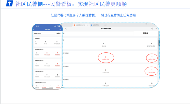 全市警民议事厅社区民警数量、议事群数量、议事群居民数量、群消息互动数量、七项任务结果数据、考核结果数据看板,形成全市数据作战指挥大屏。